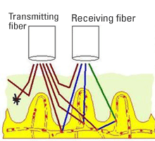 Light is transmitted to the tissue via a fibre-optic probe. When this light hits moving blood cells, it undergoes a change in wavelength (Doppler shift). The magnitude and frequency distribution of these changes are directly related to the number and velocity of blood cells, i.e. the blood perfusion.