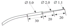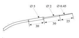 The tip (diam. 0.45mm) may be introduced directly into the tissue to the desired depth or inserted through a 22 G/0.6 I.D. cannula. For human muscle measurements, the PROBE 418 with Microtips and the PH 18 Fixation device are preferable. See also PROBE 411 and 418 with Microtips.